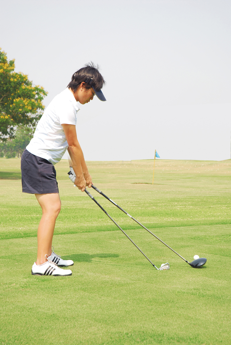 ในท่ายืน ฉากมุมของลำตัวจะคงอยู่สภาพเดิม ระยะยืนห่างจากลูกกำหนดโดยความยาวของไม้ คุณจะยืนใกล้ลูกขึ้นด้วยเหล็กที่ระยะสั้นกว่าและด้วยก้านที่ยาวกว่าของไดร์ฟเวอร์ จะทำให้คุณยืนห่างจากลูกมากขึ้น