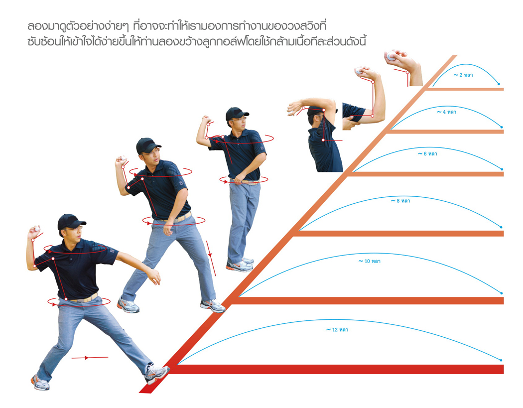 อย่างเดียวไม่ได้ ต้องแม่นระยะด้วย การที่ใช้กลไกของร่างกายหลายๆส่วนทำงานร่วมกันย่อมได้กำลังมากกว่า แต่ก็ต้องอาศัยทักษะและการฝึกซ้อมที่มากขึ้นเพื่อที่จะความคุมให้แต่ละส่วนทำงานได้อย่างสัมพันธ์กันและสม่ำเสมอแต่ที่สำคัญอย่าลืมว่าระยะทางกับความแม่นยำนั้น แปรผกผันกัน คนที่ตีไกลก็มักจะอยู่แฟร์เวย์น้อยกว่าคนที่ตีสั้น